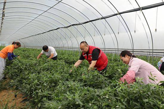 加尤镇央里村粤桂协作蔬菜种植基地第一书记和群众一起收辣椒。。周俊位摄